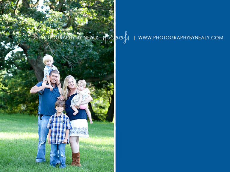 “Boy- khaki cargo shorts, light blue polo; girl- navy dress, maybe a light blue cardigan over it or a matching bow; girl2- patterned dress w/ blue color floral; dad- navy plaid shirt, jeans; mom- cream color shirt, jeans, cute shoes.”